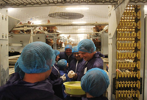 Ein Blick in die Ställe war selbstverständlich Teil des Besucherprogramms. Nach dem Stallbesuch ging es in den Vorraum der Gebäude. Dort befindet sich eine Sortieranlage. Hier bekommen die Eier den obligatorischen Aufdruck, der über die Herkunft Auskunft gibt. „Die eine Hälfte der Eier geht nach dem Verpacken an einen Großhändler, die andere Hälfte vermarkten wir selbst“, so Habermann. „Wir kaufen unsere Eier immer hier“, bemerkte dabei eine Besucherin.Natürlich tauchten auch einige Fragen auf. Hierfür standen die beiden Betriebsleiter, der Bestandstierarzt Dr. Kristian Dungelhoef sowie die Experten vom Wissenschafts- und Informationszentrum Nachhaltige Geflügelwirtschaft an der Universität Vechta (WING) und des Verbandes der Niedersächsischen Geflügelwirtschaft (NGW) Rede und Antwort.