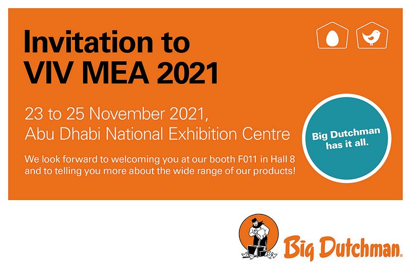 Big Dutchman is looking forward to welcoming many guests at the VIV MEA 2021 in Abu Dhabi from 23 to 25 November 2021. The impressive booth of the German poultry equipment supplier in hall 8 provides much room for intensive technical discussions about modern solutions and concepts for egg production and poultry growing. Livestock managers from the region can expect a large number of clever innovations and well thought-out solutions for their farms.