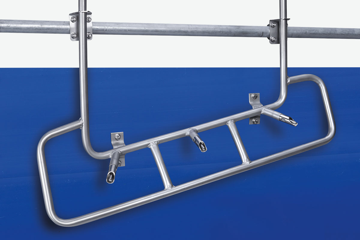 Управляя электромагнитными клапанами, установленными между главной и вспомогательной линиями, интервалы распыления и паузы системы замачивания можно регулировать индивидуально, в зависимости от степени загрязнения. В распоряжении имеются форсунки на 360°или 180°. Гибкая подвеска системы замачивания предотвращает повреждения струей воды из моющего аппарата высокого давления. Система может быть легко адаптирована к тем или иным размерам животноводческого помещения.
